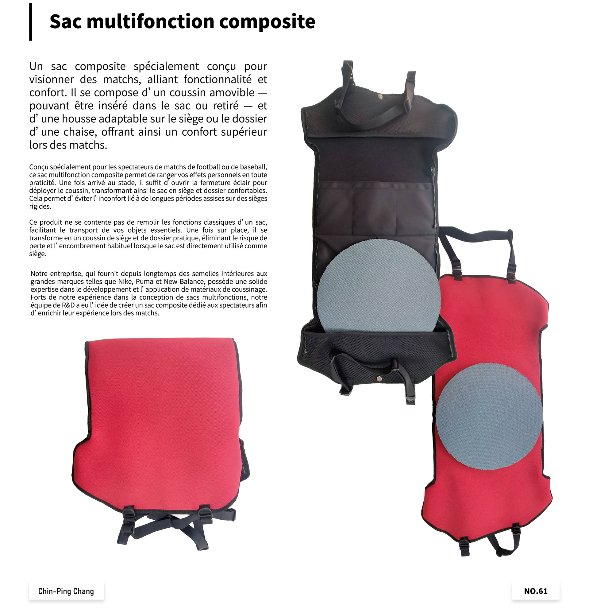 Un sac composite spécialement conçu pour visionner des matchs, alliant fonctionnalité et confort. Il se compose d'un coussin amovible - pouvant être inséré dans le sac ou retiré - et d'une housse adaptable sur le siège ou le dossier d'une chaise, offrant ainsi un confort supérieur lors des matchs.